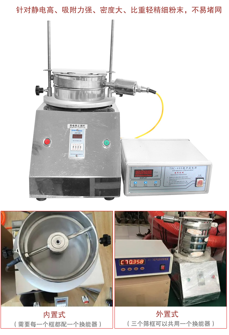 在標(biāo)準(zhǔn)檢驗篩基礎(chǔ)上增加了超聲波篩分系統(tǒng),解決了篩分200目以上高目數(shù)產(chǎn)品或普通檢驗篩難以篩分的易結(jié)塊、易帶靜電的產(chǎn)品的難題,并防止篩網(wǎng)堵塞。